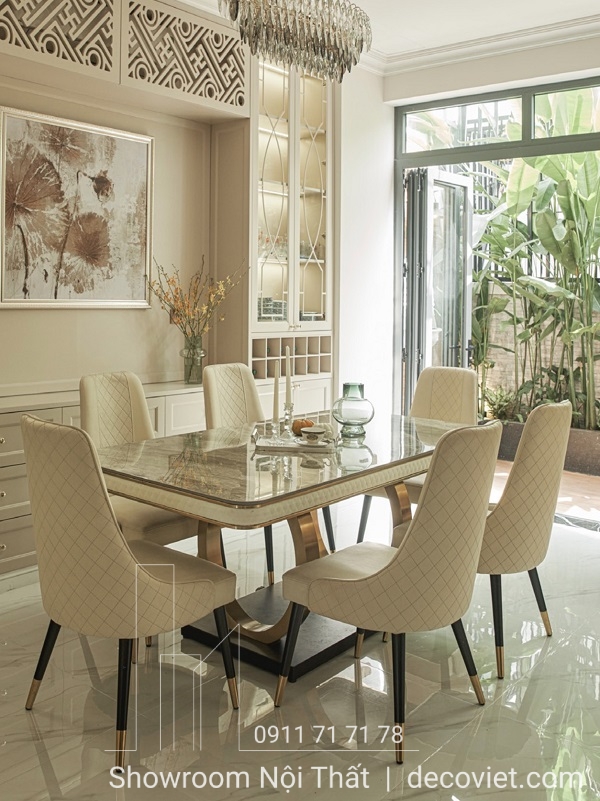 Theo đuổi sự tráng lệ xa hoa nhưng vẫn giữ nét hiện đại xen lẫn, mẫu bàn ăn phong cách tân cổ điển mang đến sự nhẹ nhàng cùng những điểm nhấn vượt bật, giúp không gian bếp thêm sang trọng và đẳng cấp.