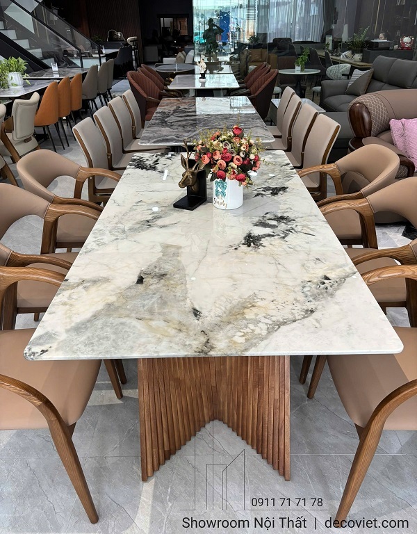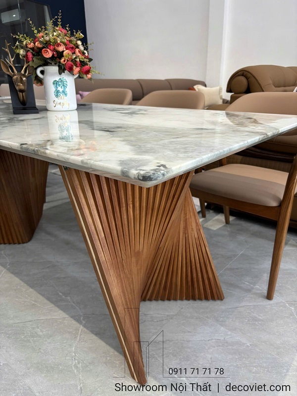 Sự kết hợp giữa chất liệu đá và gỗ tự nhiên cao cấp không chỉ mang lại cảm giác sang trọng mà còn dễ dàng kết hợp với nhiều không gian nội thất khác nhau như phòng ăn kiểu Bắc Âu, phong cách hiện đại hay Minimalist.