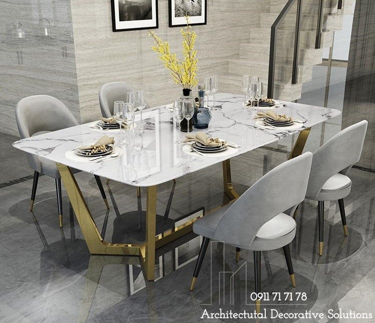 Chất Liệu : bàn inox mạ vàng mặt đá trắng vân.