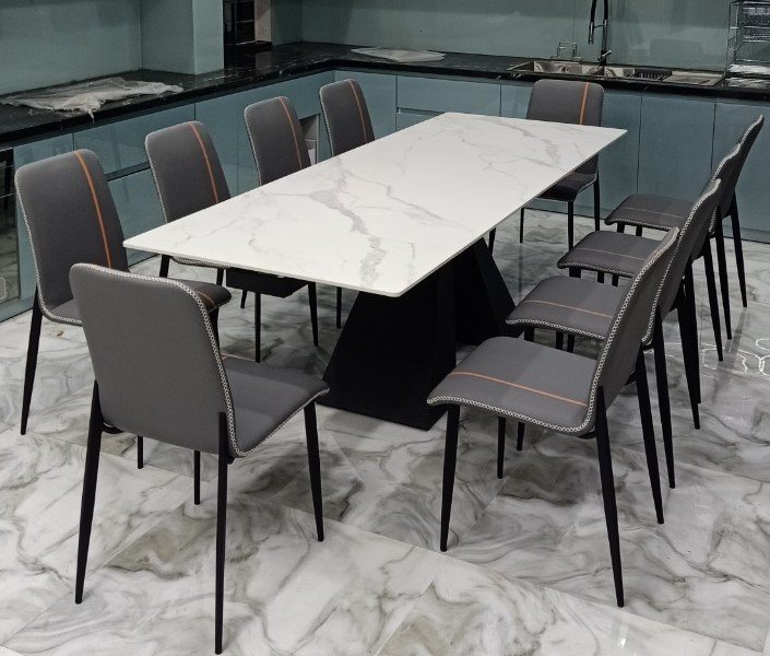 Bàn ăn sử dụng 2 chất liệu được ưu chuộng hiện hành là chân sắt và mặt đá cao cấp. Chất liệu này vừa mang đến phong cách hiện đại, vừa sang trọng lại dễ sử dụng và tuổi thọ cao. Phần chân bàn được thiết kế độc đáo với sắt khổ lớn chứ V ngược bật lên vẻ đẹp của thiết kế. Phần mặt đá sử dụng đá nhập cao cấp chống thấm dễ dàng lau chùi. Vân đá cẩm thạch cực kỳ sang trọng.
