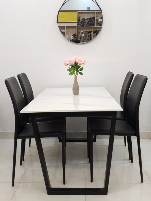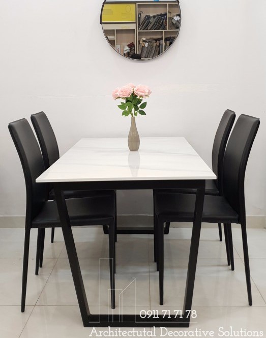 Chất Liệu : bàn chân sắt mặt đá trắng vân, ghế ăn bọc da cao cấp.