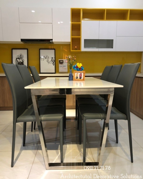 Chất Liệu : bàn chân inox mặt đá trắng vân, ghế ăn bọc da cao cấp.