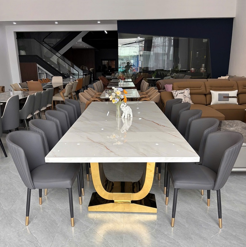 Bàn Ăn Mặt Đá 3m2 10 Người Hiện Đại 2810S sở hữu form dáng dài rộng, mặt đá trắng vân mây sang trọng kết hợp chân inox mạ vàng chắc chắn, tạo nên một tổng thể cực kỳ bề thế. Không chỉ đơn thuần là nơi dùng bữa, mẫu bàn ăn cao cấp này còn trở thành tâm điểm của phòng ăn, thể hiện rõ gu thẩm mỹ tinh tế và phong cách sống đẳng cấp của gia chủ.
