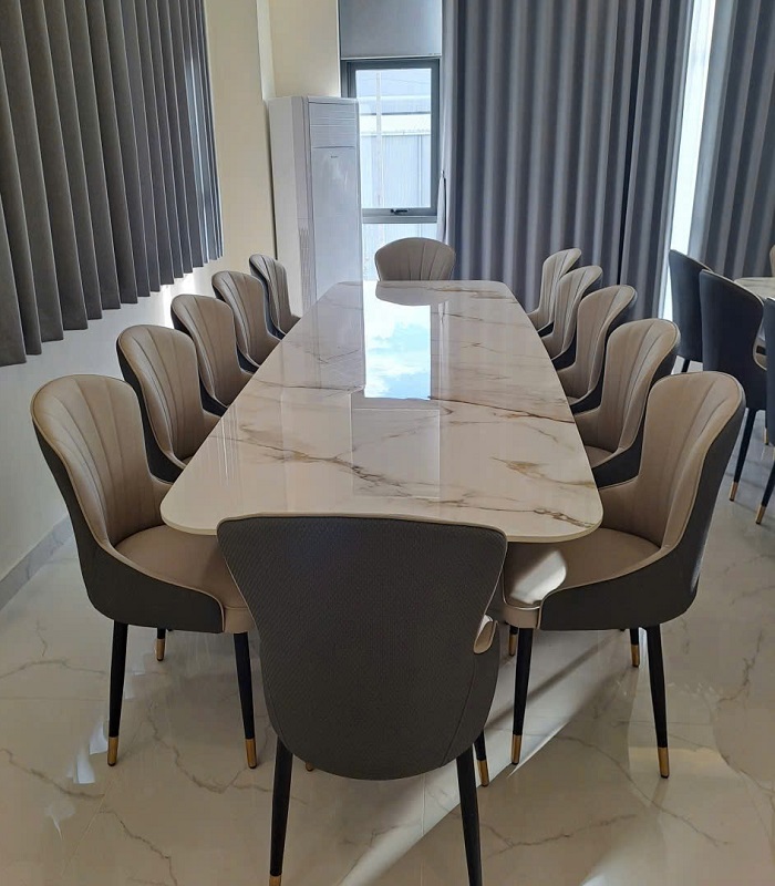 Sự kết hợp giữa thiết kế hiện đại và chất liệu cao cấp tạo nên bộ Bàn Ăn Mặt Đá 3m2 12 Người 2738S ấn tượng – lựa chọn lý tưởng cho những không gian rộng như biệt thự, villa hoặc phòng ăn cao cấp. Mặt bàn đá vân mây sang trọng, bóng mịn và dễ vệ sinh, mang đến vẻ đẹp tinh tế bền vững theo thời gian.
