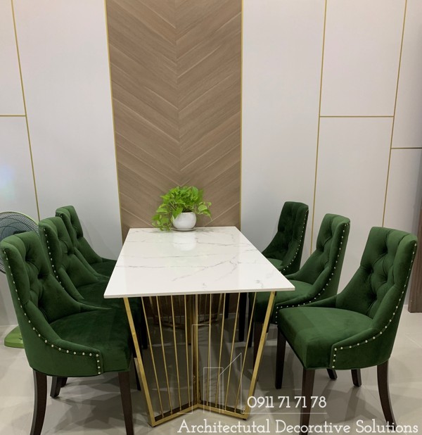 Chất Liệu : 6 bọc vải cao cấp, bàn mặt đá, chân inox mạ vàng.