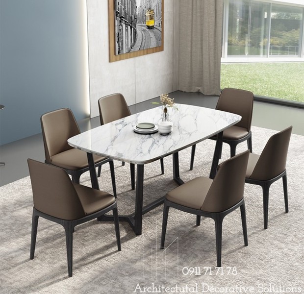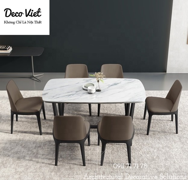 Chất Liệu : 6 ghế bọc nệm, Chân bàn gỗ tự nhiên, mặt đá trắng vân.