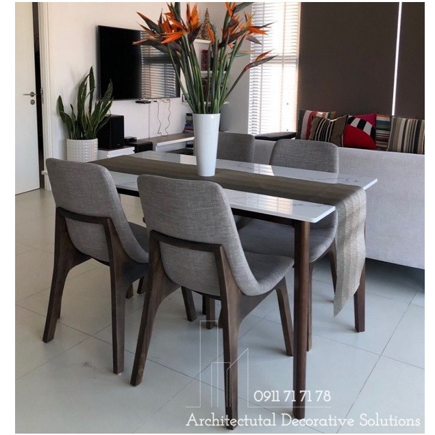 Chất Liệu : chân gỗ mặt đá trắng vân, ghế bọc vải.