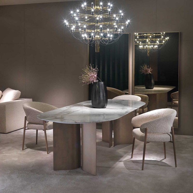 Bàn Ăn Mặt Đá Nhập Khẩu Cao Cấp 2792S là lựa chọn lý tưởng cho những gia chủ yêu thích không gian tinh tế và đẳng cấp. Phần mặt bàn ăn mặt đá trắng vân được xử lý bóng tinh xảo, vừa nhẹ nhàng lại vừa nổi bật theo phong cách châu Âu. Dáng bàn ăn mặt đá bo oval mềm mại giúp tổng thể trở nên thanh thoát, sang trọng hơn. Hệ chân trụ kim loại cao cấp là điểm nhấn giúp bộ bàn ăn trở nên vững chãi, hài hòa và đầy cuốn hút trong mọi không gian từ biệt thự đến căn hộ cao cấp.