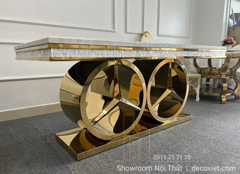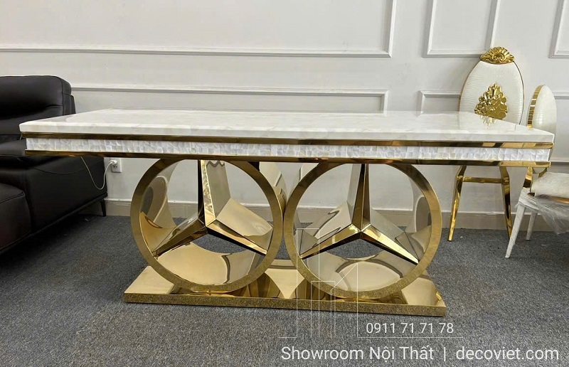 Điểm gây ấn tượng mạnh mẽ nhất của bộ bàn ăn tân cổ điển nằm ở phần chân bàn inox vàng, thiết kế theo logo Mercedes đậm chất sang trọng. Bề mặt bàn đá trắng bóng nhẹ, sang trọng và vô cùng dễ vệ sinh, giữ được vẻ tinh khôi ngay cả khi sử dụng lâu dài. Tổng thể bộ bàn ăn tân cổ điển đẹp vừa chắc chắn, vừa là điểm nhấn nổi bật giúp nâng tầm cả không gian phòng ăn.