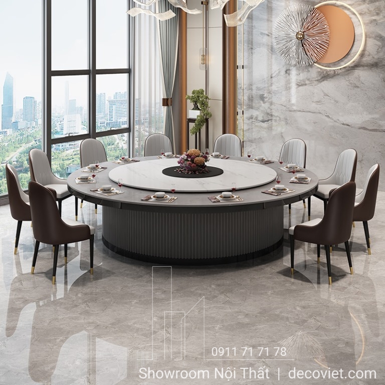 Khám phá sự kết hợp hoàn hảo giữa sự sang trọng và tiện nghi với bộ bàn ăn tròn xoay 12 ghế của DecoViet, phù hợp bài trí tại nhà hàng, khách sạn, hội nghị và nhiều không gian khác. Bàn Ăn Tròn 12 Ghế Cao Cấp 2138S không chỉ nâng tầm không gian ăn uống của bạn mà còn gây ấn tượng với kiểu dáng bàn tròn thanh lịch và chất liệu cao cấp. Đặc biệt, thiết kế thông minh của bàn tròn xoay lớn 12 ghế giúp người sử dụng dễ dàng tiếp cận món ăn từ mọi hướng, tạo sự thuận tiện và thoải mái. Bộ bàn ăn tròn 12 ghế hiện đại này chắc chắn sẽ nâng tầm không gian ăn uống của bạn, làm hài lòng ngay cả những khách hàng khó tính nhất.