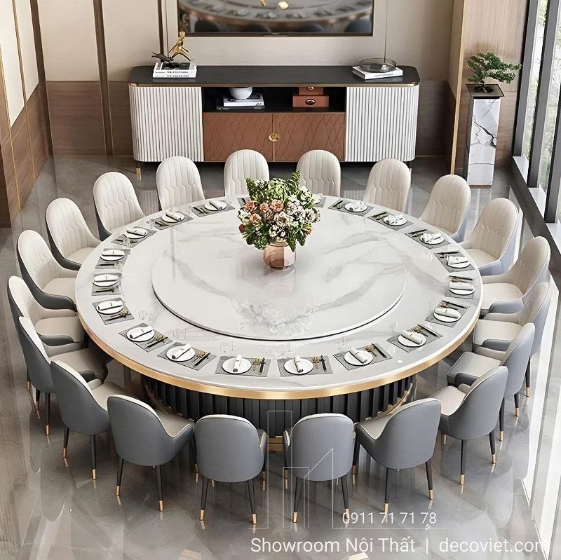 Nếu bạn đang tìm kiếm một bộ bàn ăn tròn hội tụ đủ ba yếu tố: sang trọng trong thiết kế, tiện ích trong sử dụng và bền đẹp theo thời gian, thì Bàn Ăn Tròn 20 Người Cao Cấp 2768S của DecoViet là lựa chọn không thể bỏ qua. Từng bữa cơm, từng tiếng cười và từng câu chuyện được sẻ chia quanh chiếc bàn ăn cao cấp này sẽ trở thành kỷ niệm đáng quý, đồng hành cùng gia chủ trong suốt hành trình xây dựng tổ ấm.