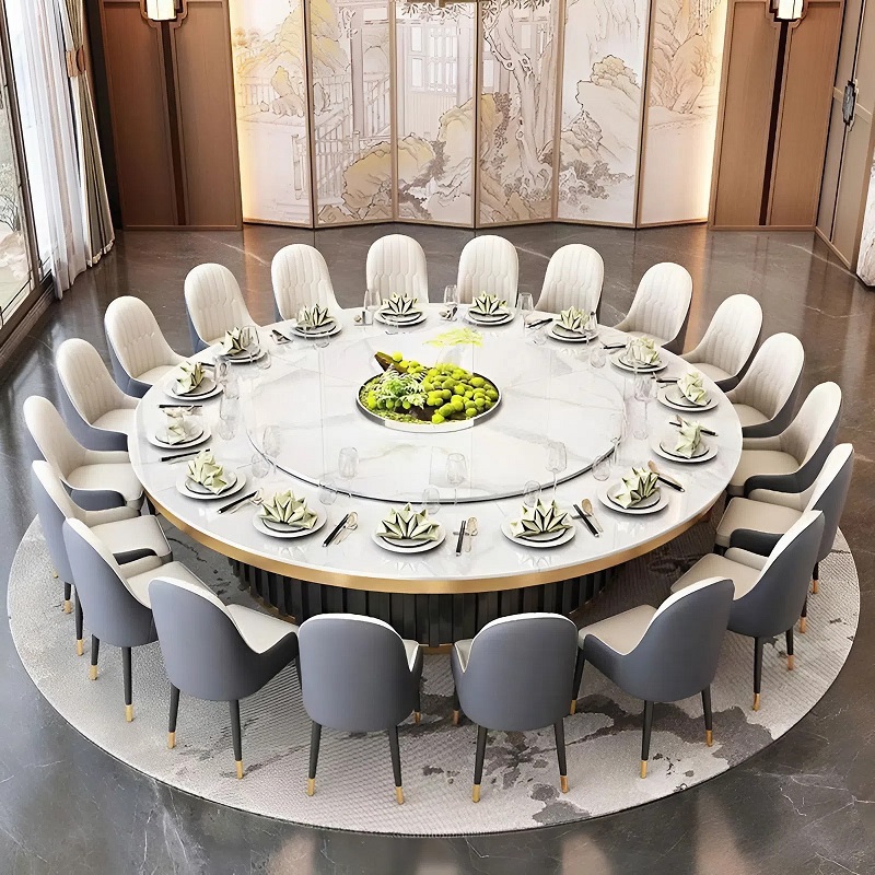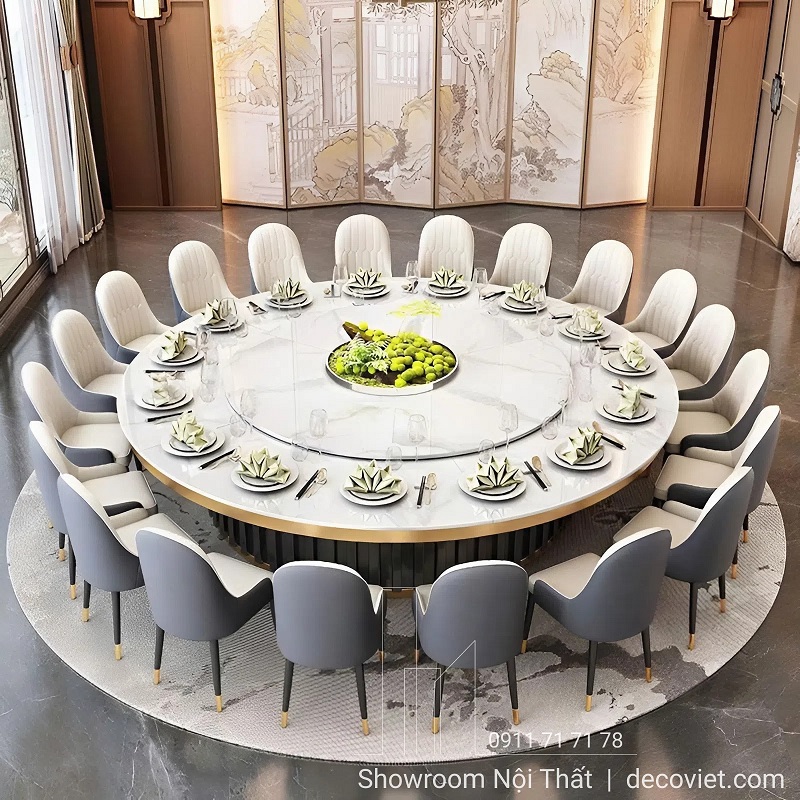 – Bàn ăn tròn 10–20 người phù hợp cho không gian nhà hàng, phòng tiệc, hội nghị hoặc khu vực VIP.