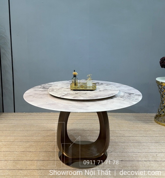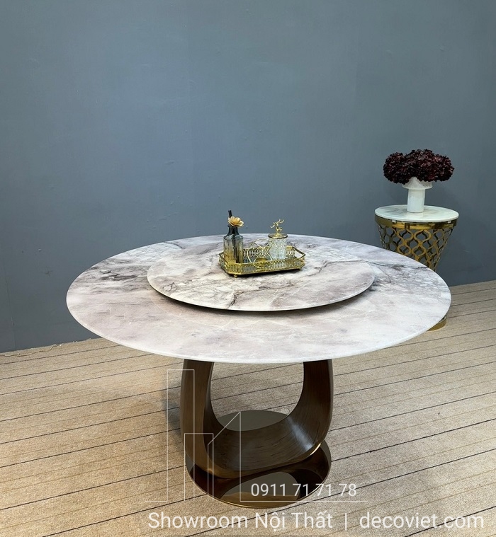 Mặt bàn được làm từ đá vân mây cao cấp, mang đến vẻ đẹp tinh tế và sáng bóng cho không gian phòng ăn. Thiết kế bàn tròn giúp các thành viên trong gia đình dễ dàng tương tác khi dùng bữa. Đặc biệt, phần mâm xoay được tích hợp ở giữa mặt bàn là điểm cộng lớn, giúp việc dùng các món ăn trở nên thuận tiện và hiện đại hơn.