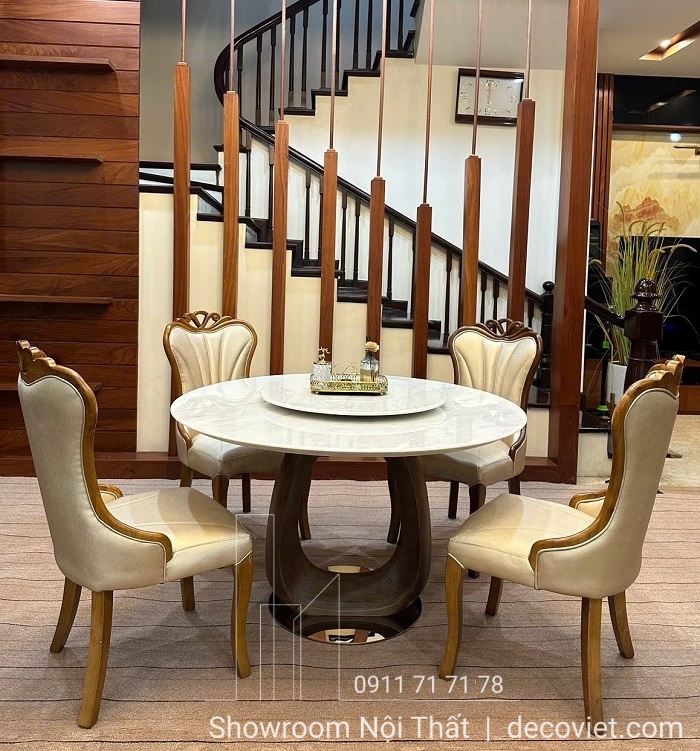Bộ bàn ăn 4 ghế thiết kế theo phong cách tân cổ điển, nổi bật với mặt đá tròn vân mây và mâm xoay tiện lợi, mang đến vẻ đẹp thanh lịch và tiện nghi cho không gian bếp. Chân bàn uốn cong nghệ thuật kết hợp cùng ghế ăn chạm khắc tinh xảo, tạo nên một tổng thể hài hòa và đẳng cấp. Bàn Ăn Tròn 4 Ghế Tân Cổ Điển Hà Nội 2260S không chỉ là nơi quây quần của gia đình mà còn là điểm nhấn thể hiện gu thẩm mỹ và phong cách sống sang trọng.