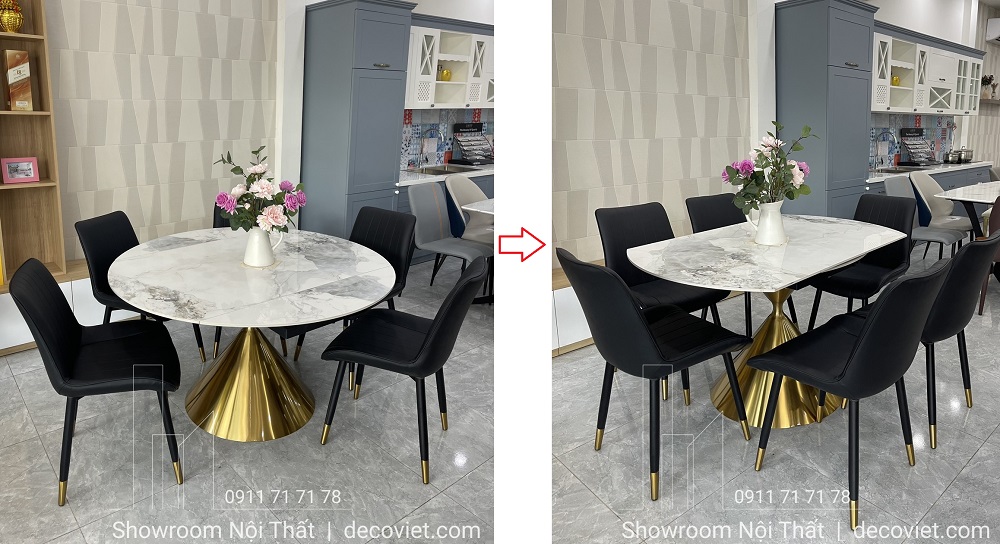 Bàn ăn thông minh gấp gọn với cơ chế thu gọn mặt bàn từ hình tròn thành chữ nhật, tạo ra sự gọn gàng và tiện ích cho không gian bếp, tiết kiệm diện tích hiệu quả. Tại DecoViet hiện nay có 2 loại bàn tròn gấp gọn là xoay thu gọn và gấp gọn từ 2 phía mặt bàn. Bạn chỉ cần 1 động tác nhẹ, là có thể xoay bàn ăn từ dạng tròn thành chữ nhật và ngược lại. Đối với bàn ăn gấp gọn từ 2 phía, bạn có thể thực hiện thu gọn 1 bên hoặc 2 bên bàn, giúp không gian bếp rộng rãi và thoáng mát hơn.