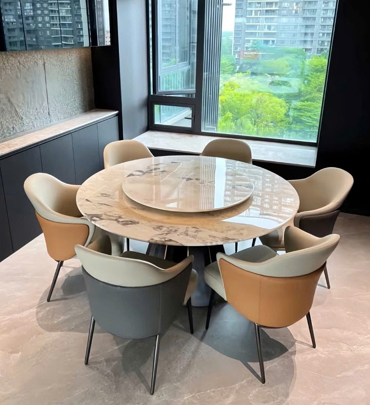 Một không gian phòng ăn hiện đại không thể thiếu đi điểm nhấn sang trọng và ấm cúng từ một bộ bàn ăn tròn mặt đá tinh tế. Bàn Ăn Tròn Xoay 6 Người 2757S chính là lựa chọn lý tưởng, kết hợp hài hòa giữa thiết kế thanh lịch và công năng tiện dụng. Mặt bàn đá bóng mịn, vân đá tự nhiên, phù hợp cho 4–6 người cùng quây quần, mang đến không khí sum vầy gần gũi. Ghế ăn bọc da êm ái, khung chắc chắn giúp mỗi bữa cơm gia đình không chỉ trọn vẹn hương vị mà còn đậm chất thẩm mỹ và đẳng cấp.