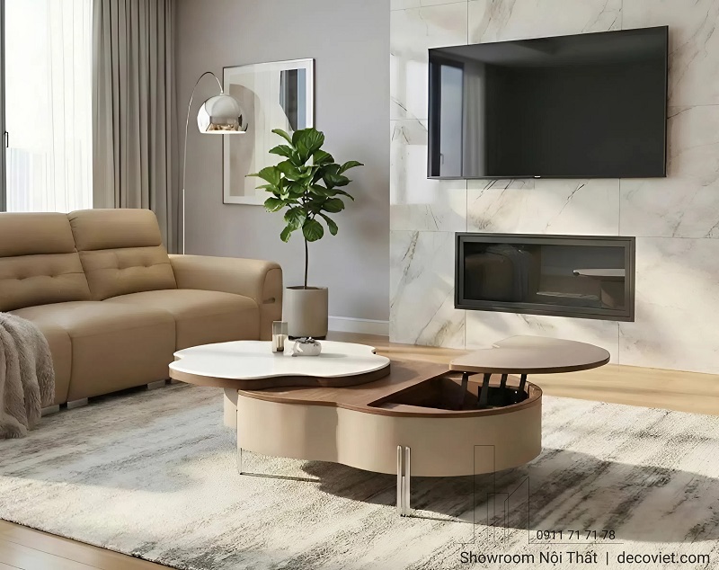 Một trong những điểm nổi bật nhất của mẫu bàn trà phòng khách đẹp này chính là mặt đá lớn có thể xoay tròn linh hoạt, giúp mở rộng diện tích sử dụng khi cần tiếp khách, bày biện trà nước, sách báo hoặc đồ trang trí. Khi không sử dụng, bạn chỉ cần xoay gọn lại – tiết kiệm diện tích, đảm bảo sự gọn gàng cho căn phòng.