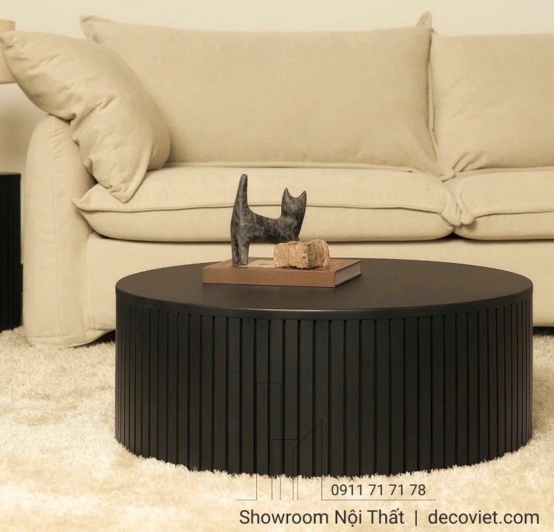 Các đường rãnh dọc quanh thân bàn trà gỗ hiện đại được xử lý tỉ mỉ, tạo nên hiệu ứng ánh sáng tinh tế và chiều sâu thẩm mỹ, khiến chiếc bàn trở thành một điểm nhấn nghệ thuật đầy cuốn hút.