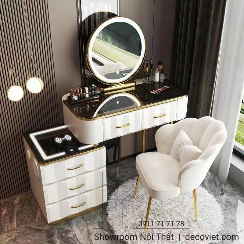 Các mẫu bàn trang điểm hiện đại, bàn trang điểm thông minh nhập khẩu có thiết kế nhẹ nhàng, thanh lịch, tích hợp các tính năng thông minh như sạc không dây, gương trang điểm có đèn led cảm ứng và loa bluetooth đi kèm, tiện lợi cho các nhu cầu sử dụng của khách hàng. Bên cạnh đó, thiết kế bàn trang điểm giá rẻ có nhiều hộc kéo, giúp tăng không gian lưu trữ tối đa. Liên hệ ngay với DecoViet để được tư vấn đặt mua bàn trang điểm nhập khẩu giá rẻ ngay hôm nay nhé!