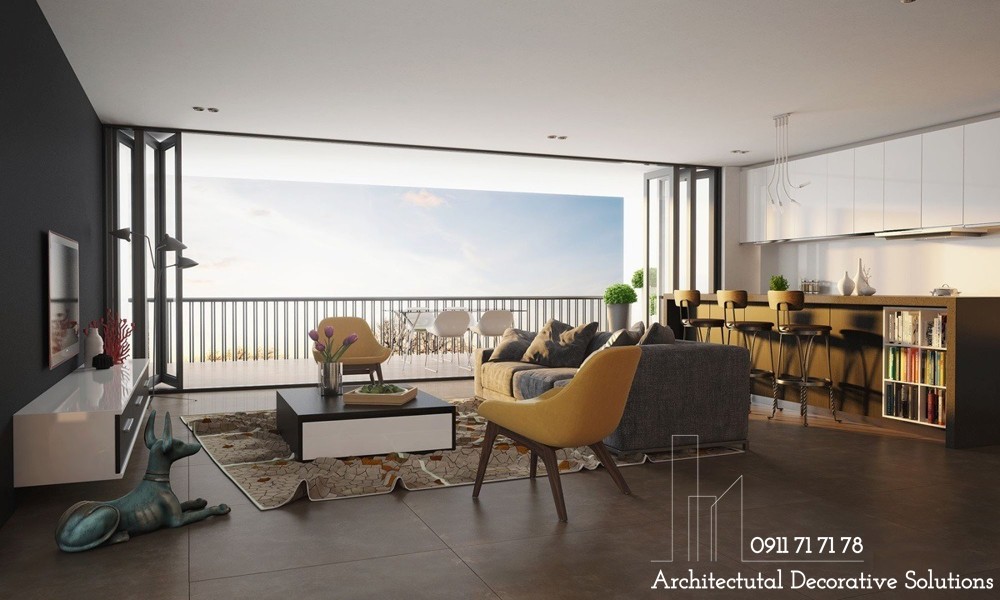 Căn hộ thiết kế phòng khách liên thông bếp tiện nghi, hiện đại
