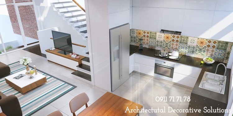 Ví dụ với màu sơn ngoại thất là trắng thì có thể chọn các loại gạch tone trầm 1 chút như nâu, nâu sáng để khu vực thiết kế phòng khách và bếp liên thông tạo vẻ đẹp sang trọng, tinh tế trong thiết kế ngôi nhà đẹp.