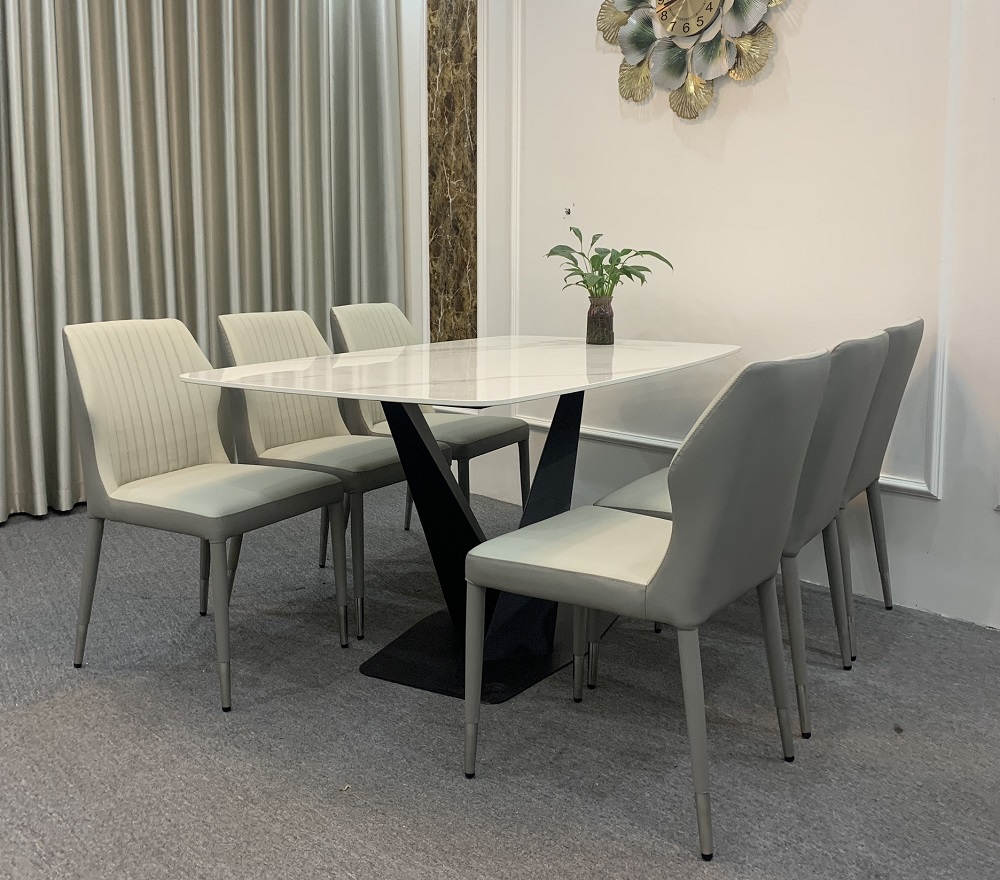 Đây cũng là một trong những sản phẩm luôn nhận được phản hồi tốt nhất của khách hàng sau khi sử dụng. Bộ bàn ăn với chân sắt, mặt đá nhập, và 6 ghế nệm cao cấp chắc chắn sẽ làm quý khách hài lòng.