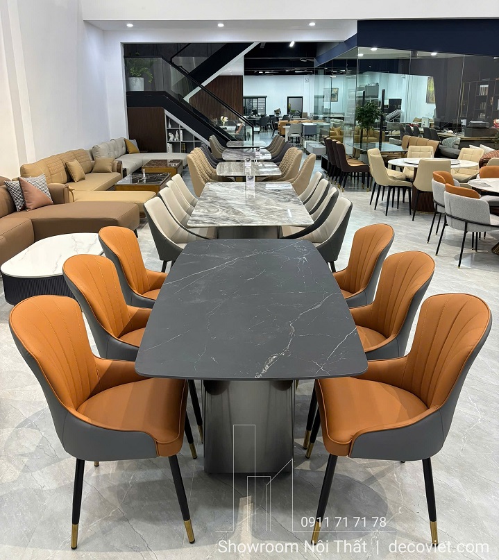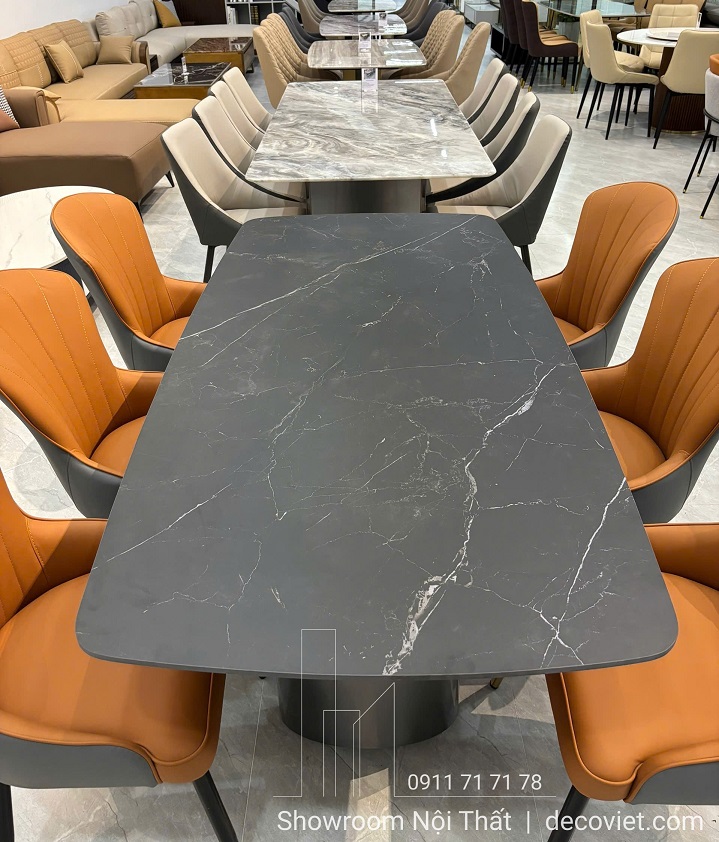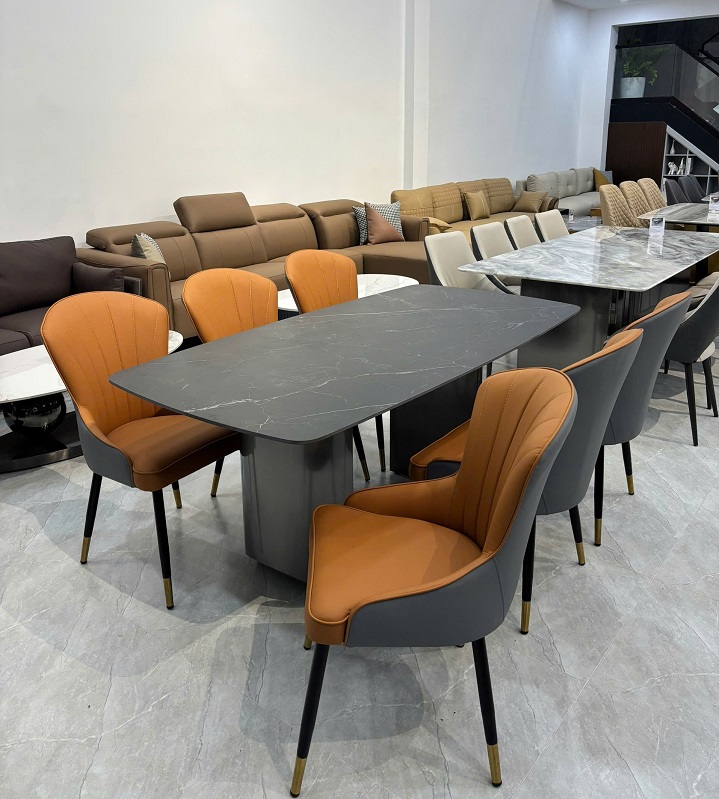 Bộ bàn ăn 6 ghế mặt đá sở hữu kiểu dáng chữ nhật bo góc mềm mại, vừa an toàn, vừa tạo cảm giác thanh thoát. Sự kết hợp giữa mặt bàn đá Ceramic đen vân và ghế bọc da cam đất thời thượng giúp bộ bàn ăn thêm nổi bật, dễ dàng trở thành tâm điểm trong phòng ăn.