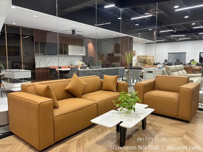Bộ ghế sofa sử dụng tông nâu cam chủ đạo, vừa ấm áp vừa sang trọng, tạo cảm giác gần gũi cho không gian tiếp khách. Đây cũng là màu sắc dễ dàng phối hợp với nhiều gam màu nội thất phổ biến như trắng, kem, xám hay vân đá, mang đến sự hài hòa tổng thể. Khi kết hợp thêm bàn trà mặt đá sang trọng và thảm lông trung tính, không gian tiếp khách sẽ trở nên ấn tượng, đẳng cấp và thể hiện gu thẩm mỹ tinh tế của gia chủ.