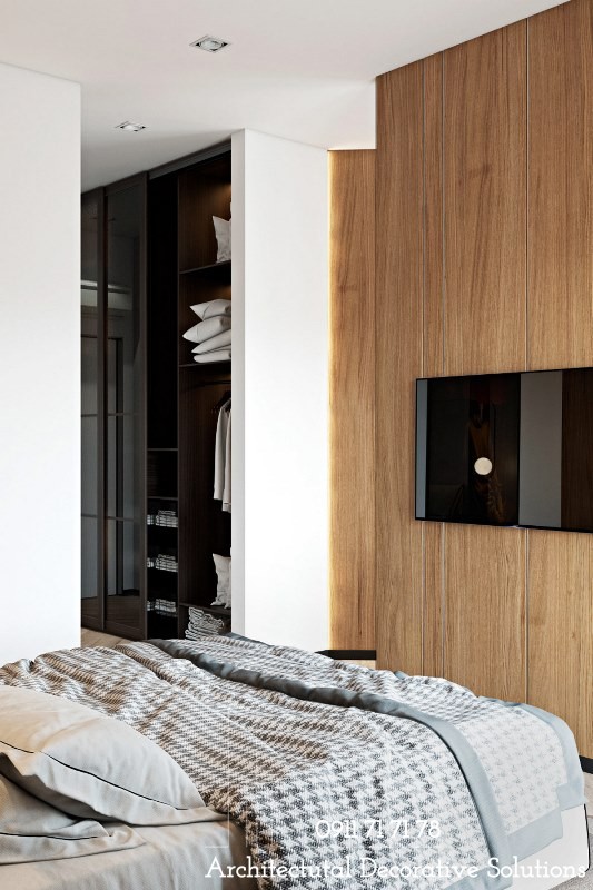 Bức tường này không chỉ cung cấp một giải pháp đảm bảo màn hình đủ gần để nhìn, nó còn làm cho khu vực giường ngủ có cảm giác khép kín và thân mật hơn một chút.