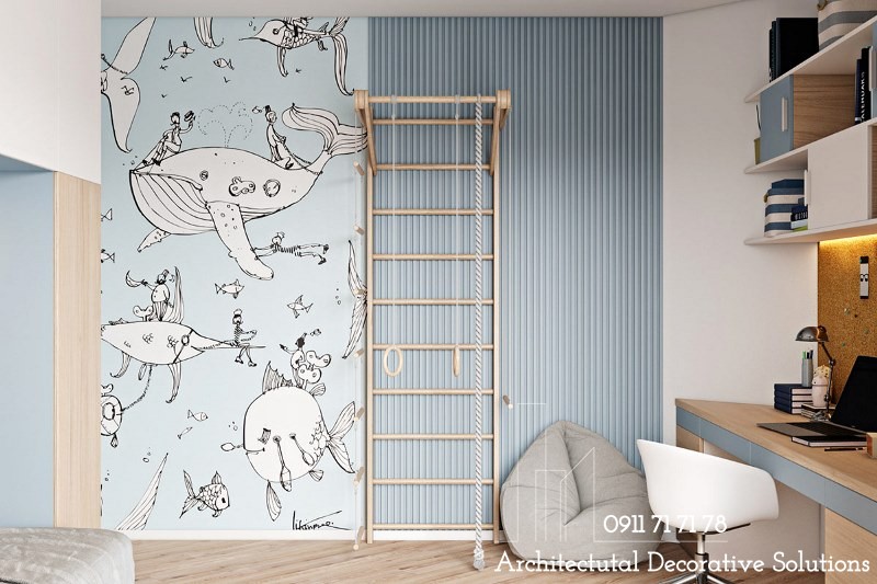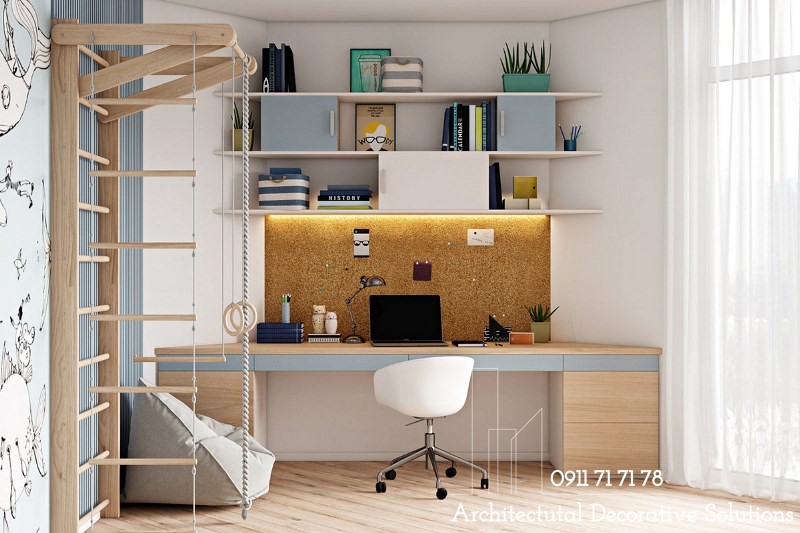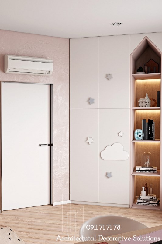 Phòng ngủ màu hồng nhạt được thiết kế cho bé gái. Điều này ngay lập tức thu hút ánh mắt với sự quyến rũ của nó – một không gian được thiết kế bắt mắt và ấn tượng. Một không gian học tập được bố trí góc phòng cung cấp một nơi thoải mái cho bé học tập và sáng tạo .