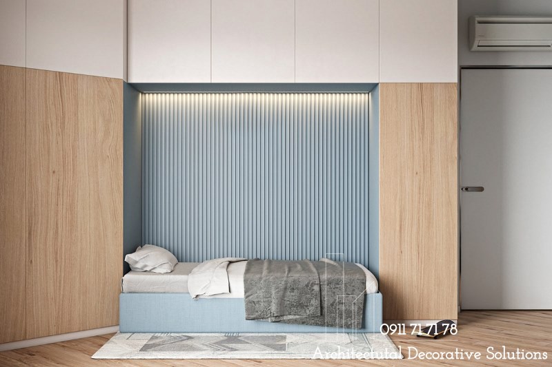 Tiếp theo, để xem nhanh phòng ngủ màu xanh cho bé trai. Điều này bắt đầu với một cảnh đơn giản – một chiếc giường nhỏ ấm cúng được bố trí âm tường.