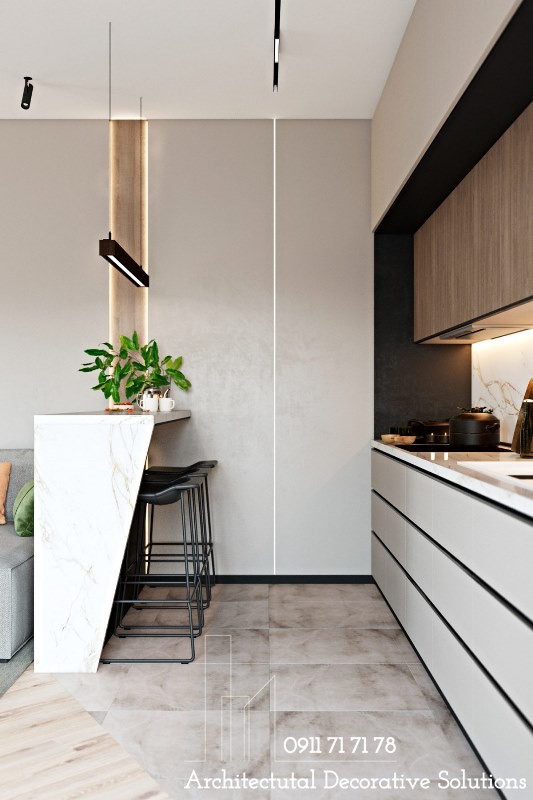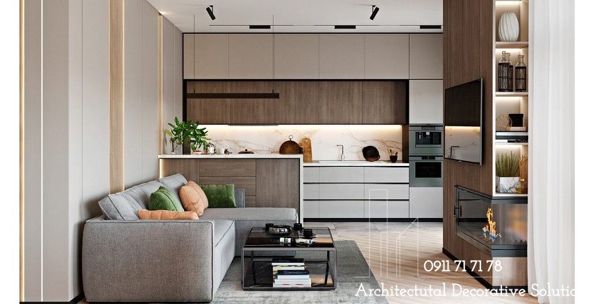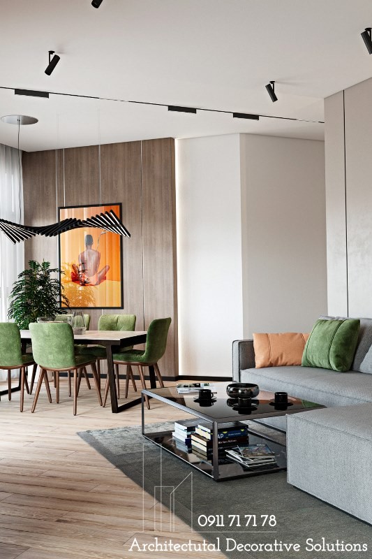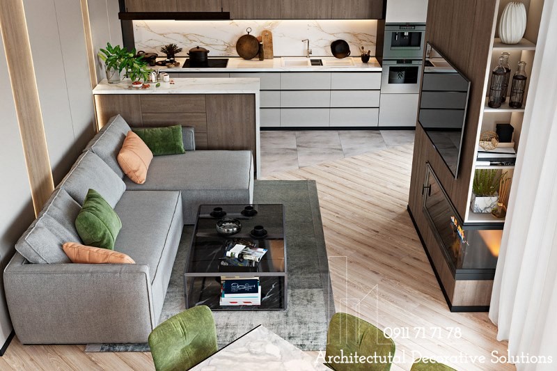Căn nhà được thiết kế theo không gian mở. Đây là khu vực sinh hoạt và nhà bếp với bảng màu trung tính và gỗ tự nhiên ấm áp tạo các được nét hiện đại sắc nét. Điểm nhấn của màu xanh ngọc lục bảo và cam nhạt thêm một chút năng lượng.