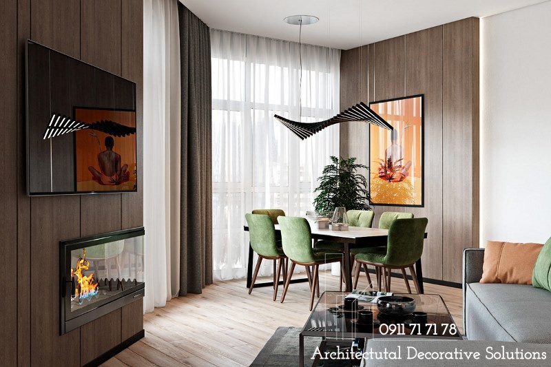 Nó cũng giúp di chuyển tivi gần hơn với khu vực chỗ ngồi. Căn phòng được cung cấp ánh sáng tự nhiên bởi cửa sổ mở rộng. Ban đêm, một chiếc đèn chùm hiện đại trên cao mang đến bầu không khí ấm áp và chào đón.