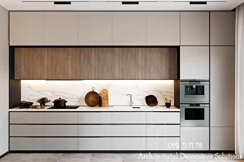 Đây là một bức tường nhà bếp thiết kế mang không thiếu các không gian lưu trữ, từ dãy ngăn kéo để tủ cao.