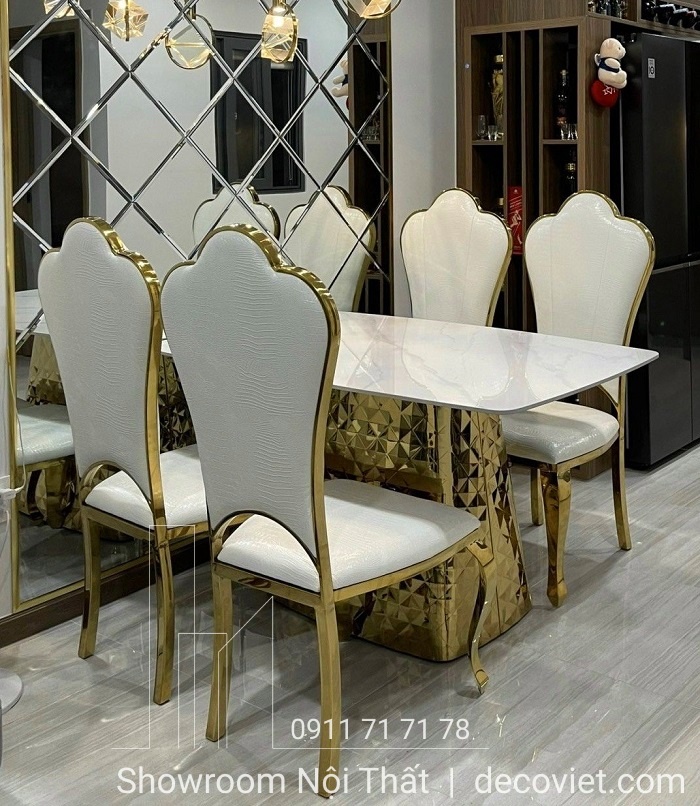 Bộ bàn ăn mặt đá chân inox mạ vàng là sự hòa quyện hoàn hảo giữa đẳng cấp và tiện ích. Bộ bàn ăn không chỉ là nơi tận hưởng bữa cơm mà còn là biểu tượng của sự sang trọng và cá tính trong không gian ăn uống của bạn. Hãy để Bộ Bàn Ghế Ăn 4 Ghế 1682S làm cho không gian bếp nhà bạn trở nên đẳng cấp và ấn tượng hơn.
