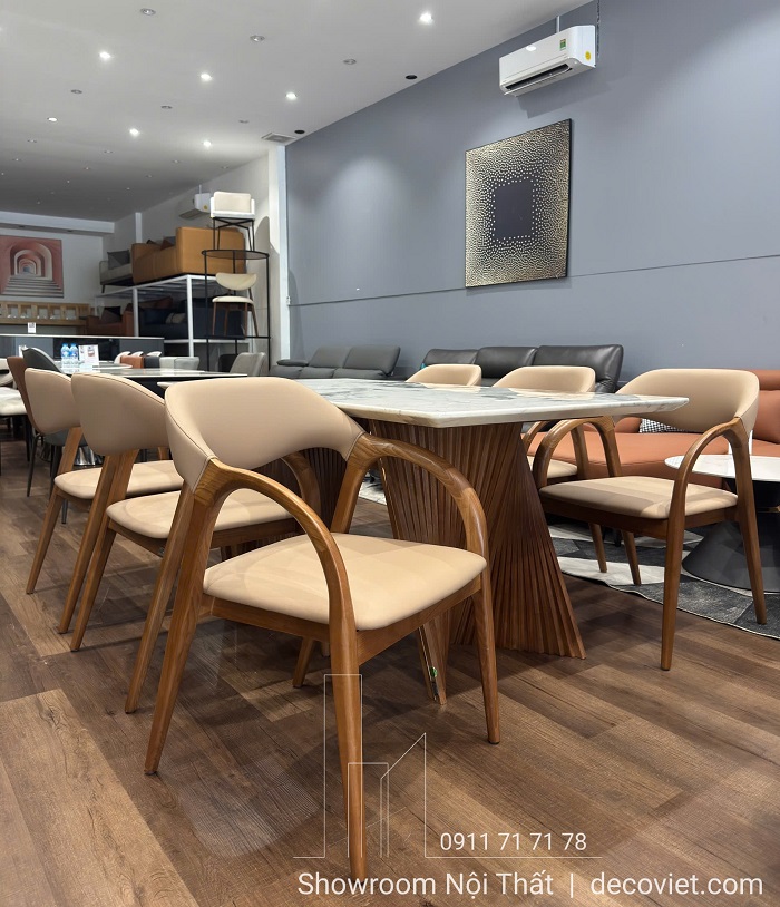Bàn Ăn 6 Ghế Mặt Đá Chân Gỗ 2610S sở hữu thiết kế tối giản theo phong cách đương đại, tập trung vào những đường cong mềm mại và sự chỉn chu trong từng chi tiết.