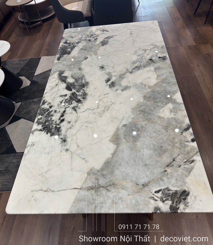 Phần mặt bàn của bàn ăn mặt đá 6 ghế được gia công từ đá cao cấp, với họa tiết vân mây tự nhiên và tông màu trắng xám điểm xanh thanh thoát. Bề mặt được xử lý phủ bóng giúp chống thấm nước, chống trầy xước và dễ dàng vệ sinh.