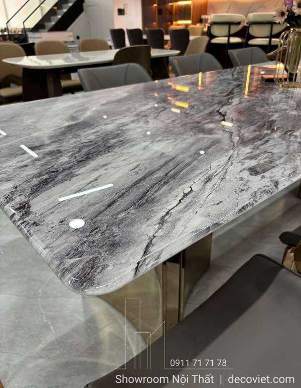 Điểm nhấn nổi bật của mẫu bàn ăn 8 ghế mặt đá nằm ở mặt đá xám vân tự nhiên với bề mặt nhẵn mịn, hạn chế bám bẩn và dễ lau chùi trong quá trình sử dụng mỗi ngày. Khi kết hợp cùng chân inox vàng sang trọng, tổng thể bàn ăn tạo hiệu ứng “nâng tầm” cực mạnh cho phòng bếp – vừa hiện đại, vừa có khí chất riêng. Đây cũng là ưu điểm lớn của dòng bàn ăn mặt đá cao cấp: đẹp sang lâu dài, bền bỉ theo thời gian và phù hợp nhu cầu sử dụng thực tế của gia đình.