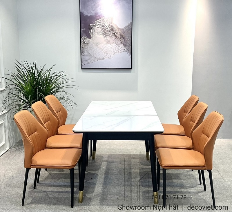 Bàn ăn sử dụng 2 chất liệu được ưu chuộng hiện hành là chân gỗ và mặt đá cao cấp. Chất liệu này vừa mang đến phong cách hiện đại, vừa sang trọng lại dễ sử dụng và tuổi thọ cao. Phần chân bàn được thiết kế vững chắc, phần mặt đá sử dụng đá nhập cao cấp chống thấm dễ dàng lau chùi, vân đá cực kỳ sang trọng. Màu sắc ghế ăn được phối hài hòa với bàn ăn tạo nên một tổng thể có tính thẩm mỹ cao.