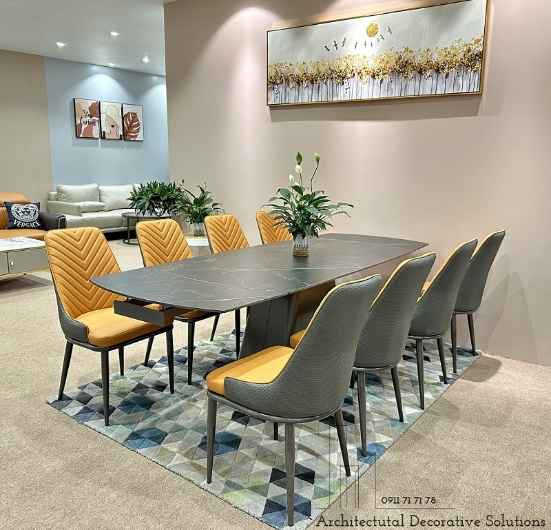 Bàn ăn sử dụng 2 chất liệu được ưu chuộng hiện hành là chân sắt và mặt đá cao cấp. Chất liệu này vừa mang đến phong cách hiện đại, vừa sang trọng lại dễ sử dụng và tuổi thọ cao. Phần chân bàn được thiết kế độc đáo với sắt khổ lớn bật lên vẻ đẹp của thiết kế. Phần mặt đá sử dụng đá nhập cao cấp chống thấm dễ dàng lau chùi.