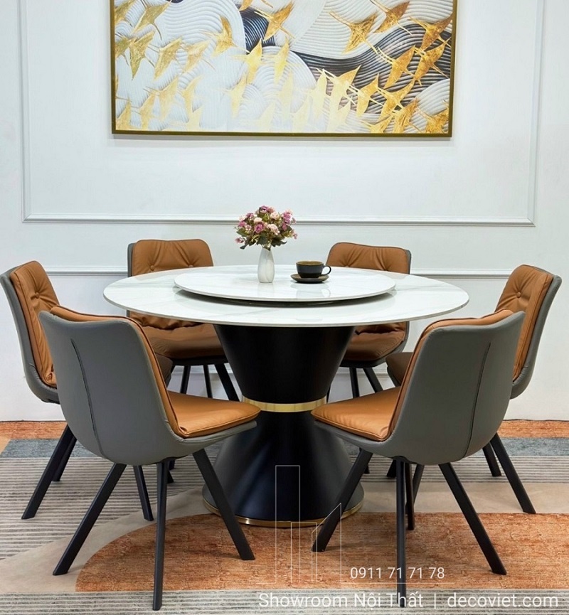 Bàn ăn với đường kính 130cm rộng rãi, có thể sắp xếp được lên đến 10 ghế ăn, phù hợp với gia đình nhiều thành viên hoặc gia đình hay có khách ghé thăm. Bộ ghế ăn với thiết kế sang trọng, màu sắc hài hòa với bàn ăn sẽ tạo nên điểm nhấn cho gian bếp của bạn.