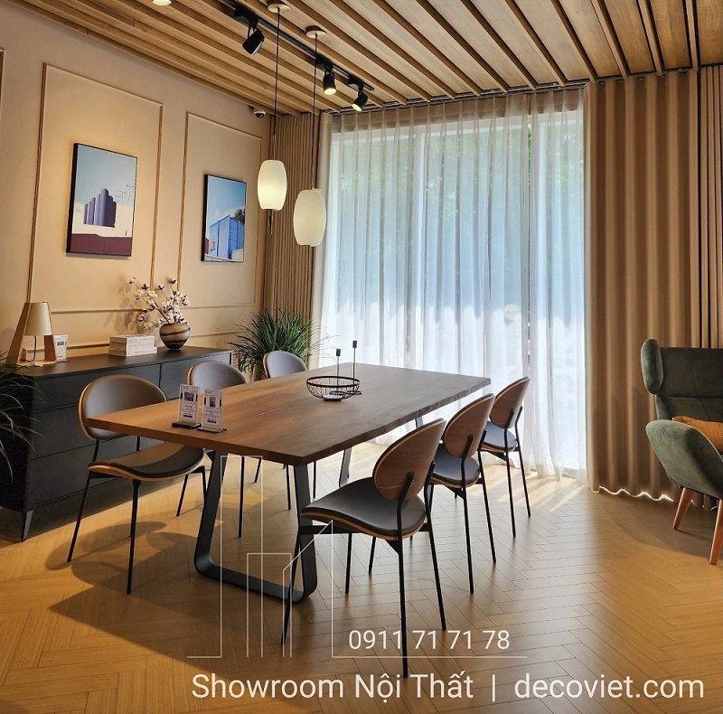 Chất liệu: Bàn chân sắt mặt gỗ Laminate, ghế ăn da bò thật.