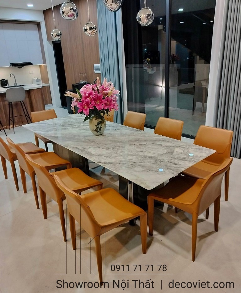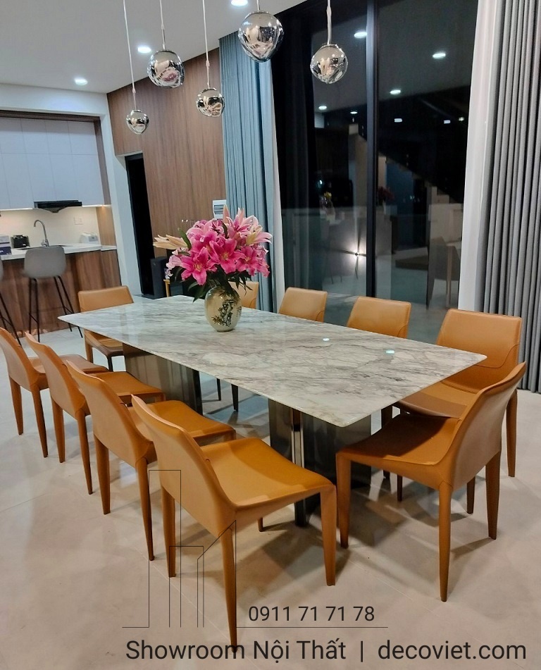 Một không gian phòng bếp rộng rãi nên sở hữu một bộ bàn ghế ăn xứng tầm. Bởi vì bên cạnh mang lại sự sang trọng và ấn tượng cho không gian, mà bộ bàn ăn 10 ghế còn giúp cho căn bếp trở nên hài hòa, đáp ứng đủ nhu cầu sử dụng cho gia đình. Bàn Ăn Mặt Đá 10 Ghế Nhập Khẩu 1676S là mẫu bàn ăn mặt đá cao cấp mà DecoViet muốn gợi ý đến bạn. Với thiết kế hoàn hảo từ kiểu dáng, chất lượng bền bỉ vượt trội, mẫu bàn ăn 10 ghế hiện đại này giúp căn bếp của bạn trở nên đẳng cấp và tinh tế hơn, đồng thời giúp phục vụ tốt những bữa ăn mỗi ngày và khi gia đình bạn tổ chức những buổi tiệc tùng, họp mặt ấm cúng.