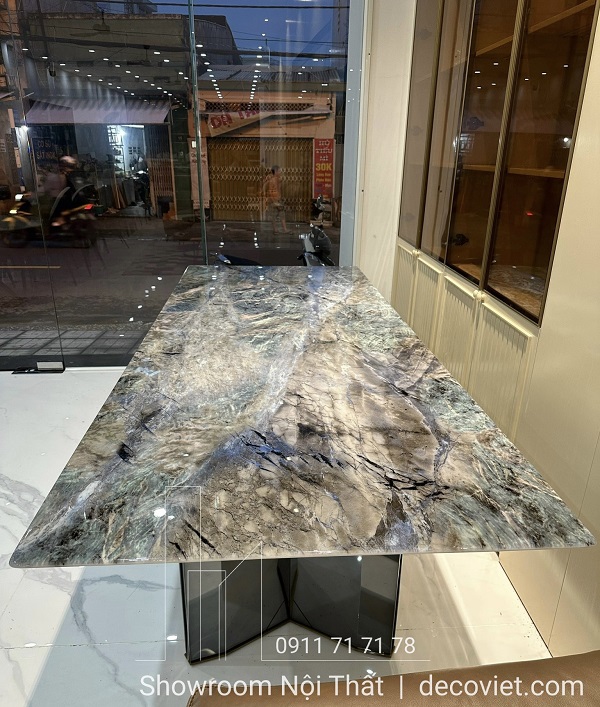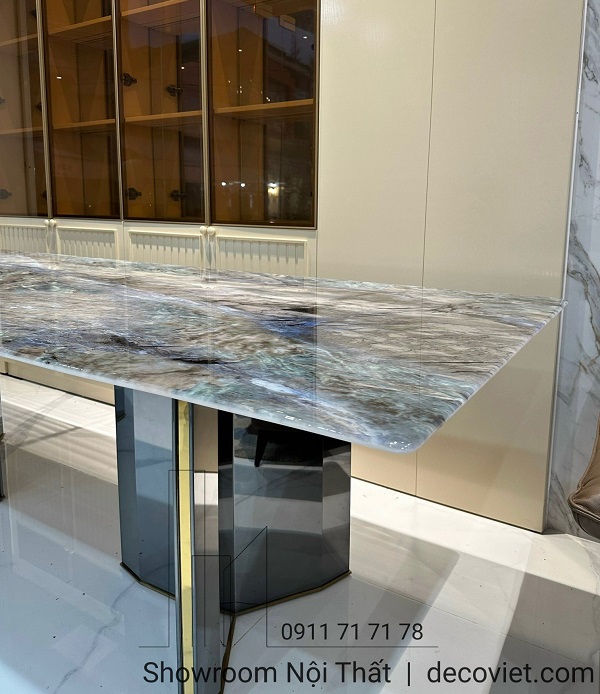 Bàn ăn mặt cẩm thạch tự nhiên luôn đi đầu trong sứ mệnh mang đến vẻ đẹp sang trọng và tinh tế cho không gian bếp gia đình. Mẫu bàn ăn này nổi bật, ấn tượng nhờ những đường vân đá tự nhiên, tươi sáng mang đến nét đẹp, sự khác biệt cho căn nhà của bạn. Mặt đá cũng được phủ thêm một lớp sơn bóng, giúp bảo vệ bề mặt và vân đá, nếu bạn biết sử dụng đúng cách sẽ giúp bàn ăn mặt đá này bền đẹp lâu dài theo thời gian.