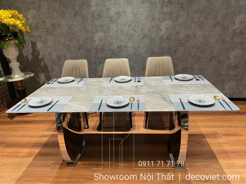 Một bộ bàn ghế ăn nhập khẩu hiện đại cao cấp vừa khẳng định được vị thế của gia chủ cũng vừa tạo nên nét đẹp riêng biệt cho không gian ngôi nhà. Bộ bàn ăn mặt đá cẩm thạch tự nhiên hiện đại, chân inox tráng gương sáng bóng sẽ mang đến sự sang trọng, đẳng cấp trong từng đường nét, góp phần tạo dựng nên điểm nhấn ấn tượng cho căn bếp, từ khâu thiết kế, chọn kích thước giữa bàn ăn và ghế ăn, chất liệu mặt đá, kiểu dáng đều được DecoViet chọn lựa kỹ càng để tạo nên một sản phẩm đẹp và bắt mắt.