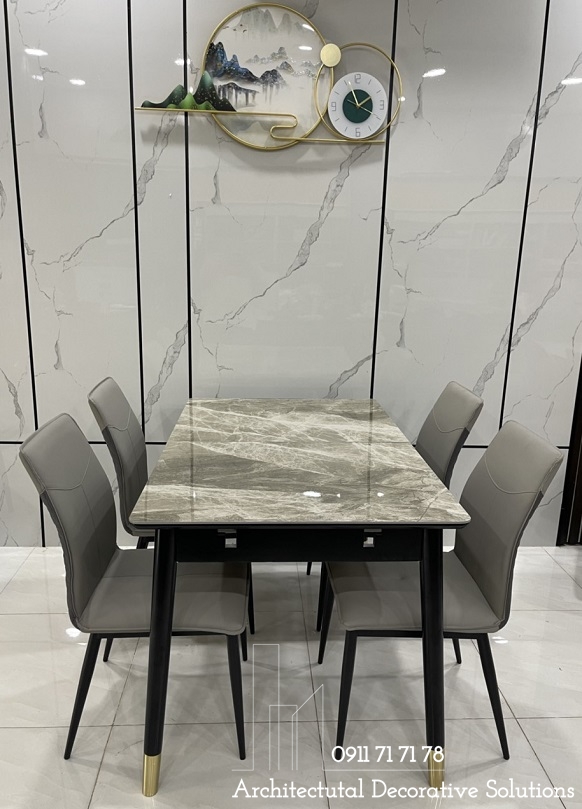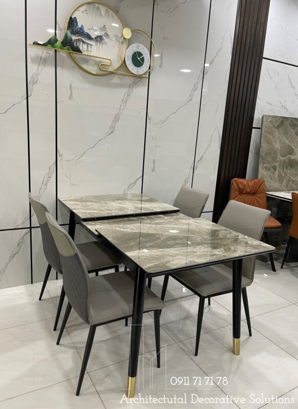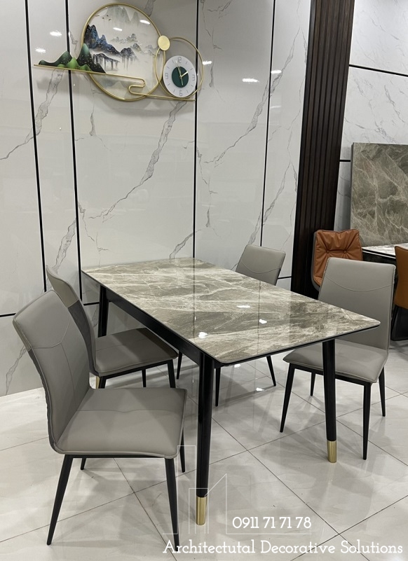 Bàn ăn sử dụng 2 chất liệu được ưu chuộng hiện hành là chân gỗ và mặt đá cao cấp. Chất liệu này vừa mang đến phong cách hiện đại, vừa sang trọng lại dễ sử dụng và tuổi thọ cao.