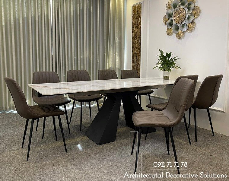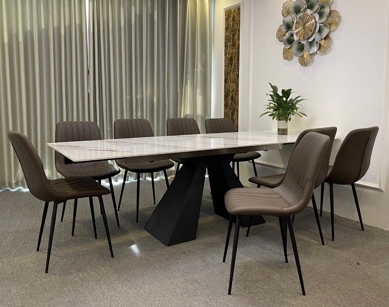 Bàn ăn sử dụng 2 chất liệu được ưu chuộng hiện hành là chân sắt và mặt đá cao cấp. Chất liệu này vừa mang đến phong cách hiện đại, vừa sang trọng lại dễ sử dụng và tuổi thọ cao. Phần chân bàn được thiết kế độc đáo, mặt đá sử dụng đá nhập cao cấp chống thấm dễ dàng lau chùi, vân đá cực kỳ sang trọng và hiện đại.