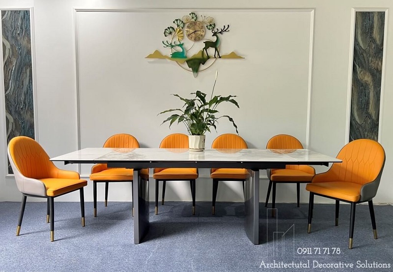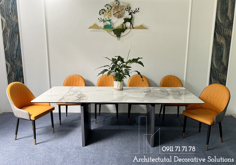 Bàn ăn sử dụng 2 chất liệu được ưu chuộng hiện hành là chân sắt và mặt đá cao cấp. Chất liệu này vừa mang đến phong cách hiện đại, vừa sang trọng lại dễ sử dụng và tuổi thọ cao. Phần chân bàn được thiết kế độc đáo với sắt khổ lớn uốn cong bật lên vẻ đẹp của thiết kế. Phần mặt đá sử dụng đá nhập cao cấp chống thấm dễ dàng lau chùi. Vân đá cẩm thạch cực kỳ sang trọng.