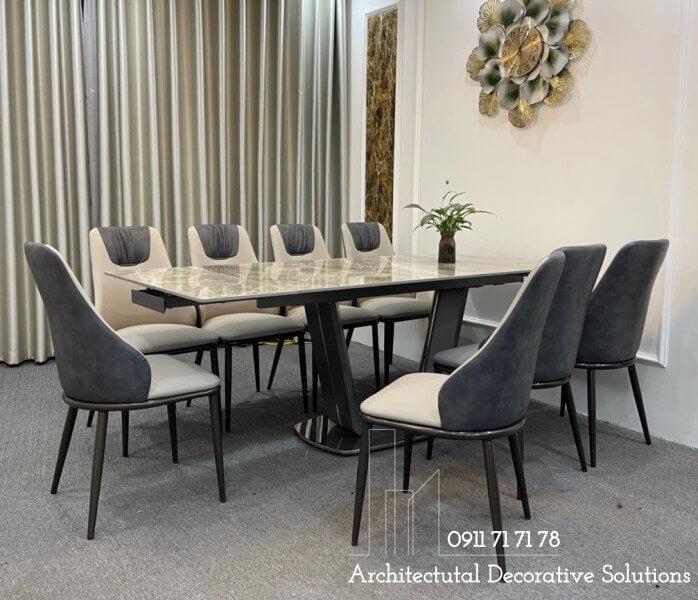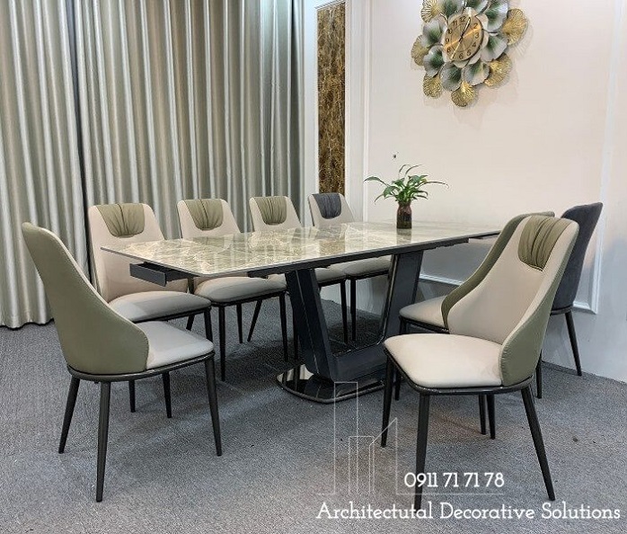 Bàn ăn sử dụng 2 chất liệu được ưu chuộng hiện hành là chân sắt và mặt đá cao cấp. Chất liệu này vừa mang đến phong cách hiện đại, vừa sang trọng lại dễ sử dụng và tuổi thọ cao. Phần chân bàn được thiết kế độc đáo với sắt khổ lớn uốn cong bật lên vẻ đẹp của thiết kế. Phần mặt đá sử dụng đá nhập cao cấp chống thấm dễ dàng lau chùi. Vân đá cẩm thạch cực kỳ sang trọng.