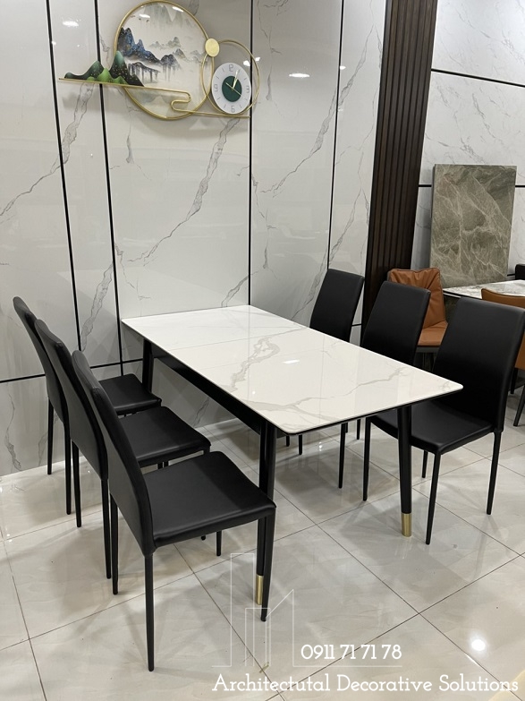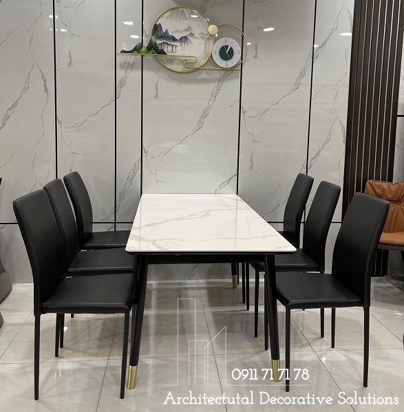 Bàn ăn sử dụng 2 chất liệu được ưu chuộng hiện hành là chân gỗ và mặt đá cao cấp. Chất liệu này vừa mang đến phong cách hiện đại, vừa sang trọng lại dễ sử dụng và tuổi thọ cao.
